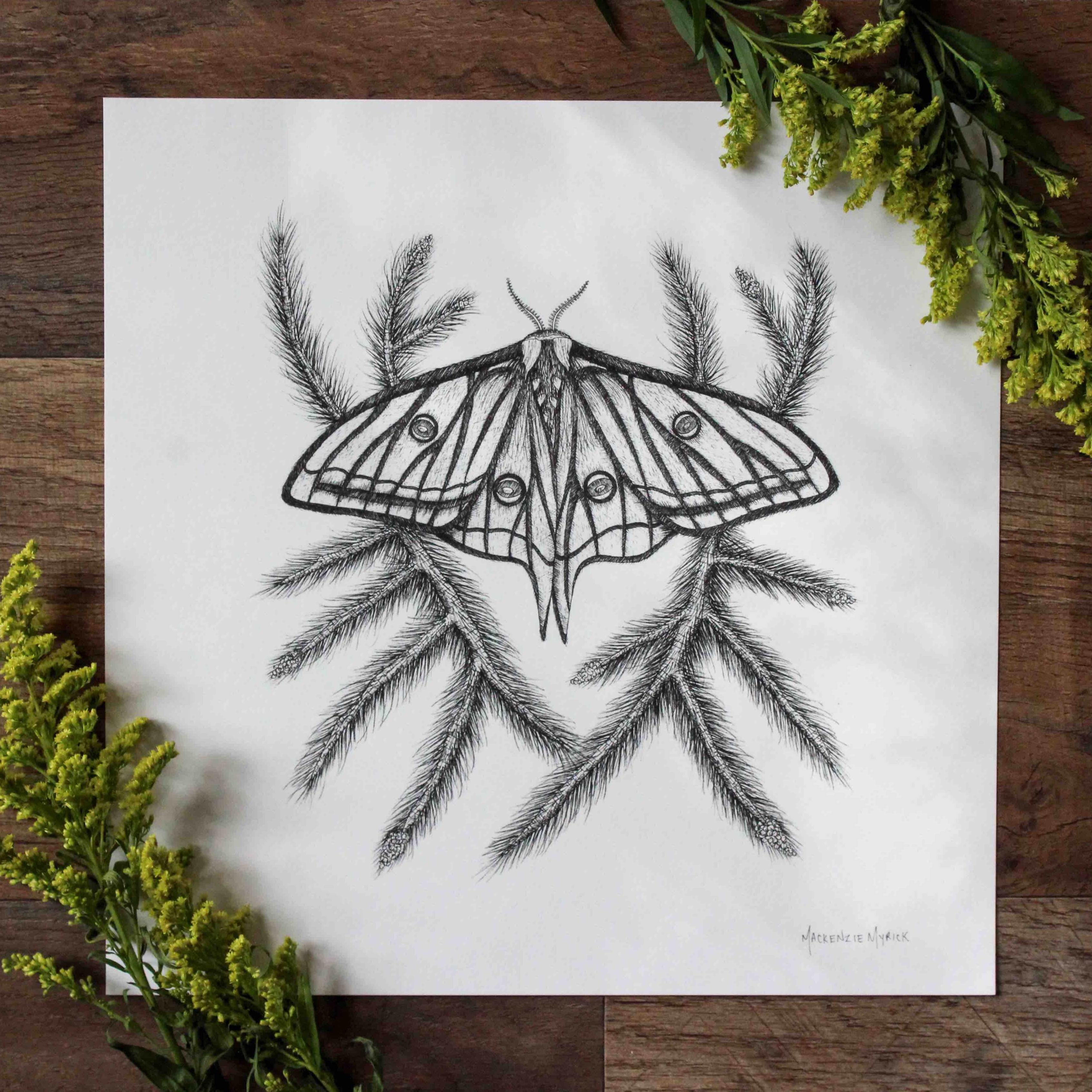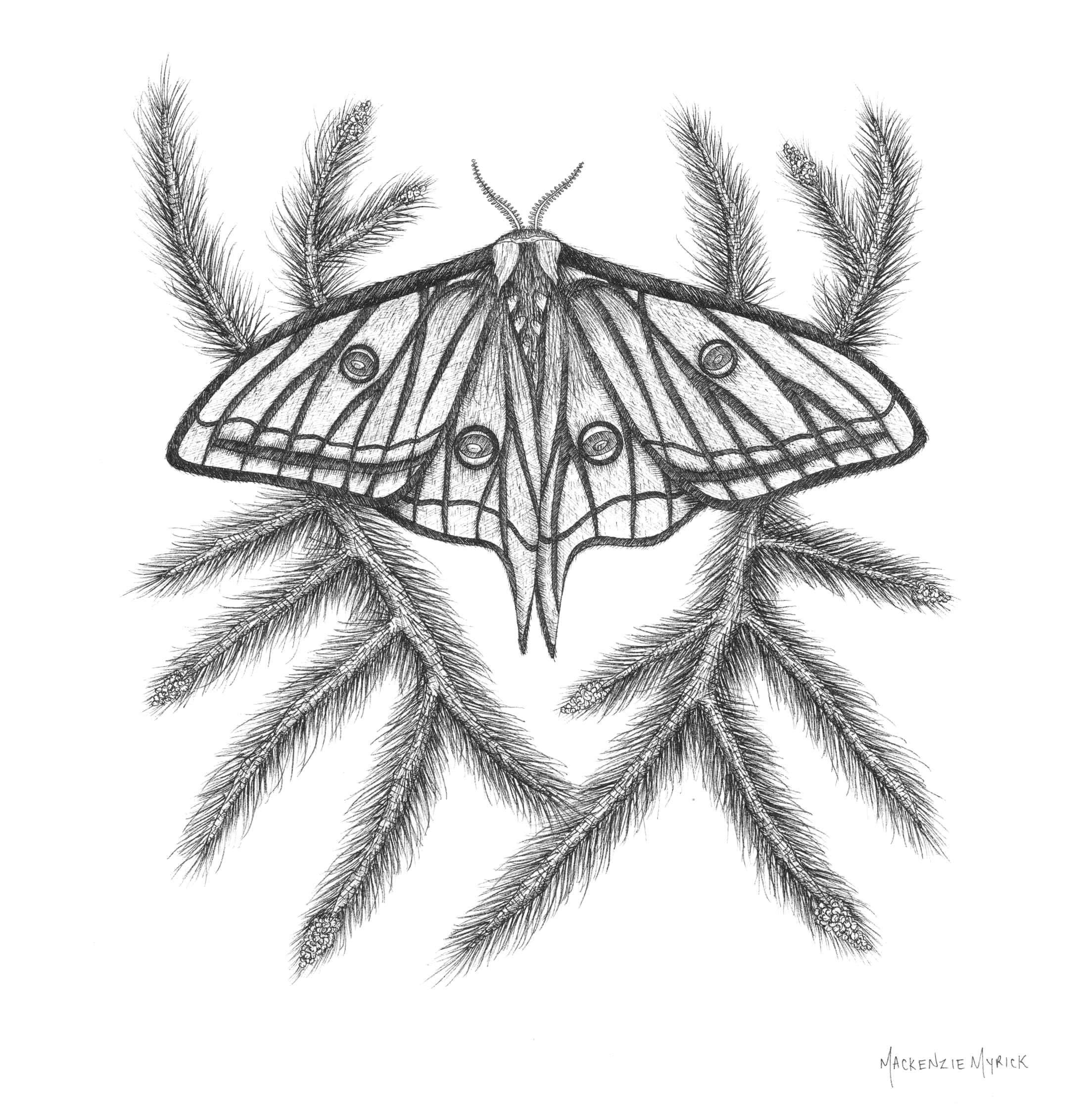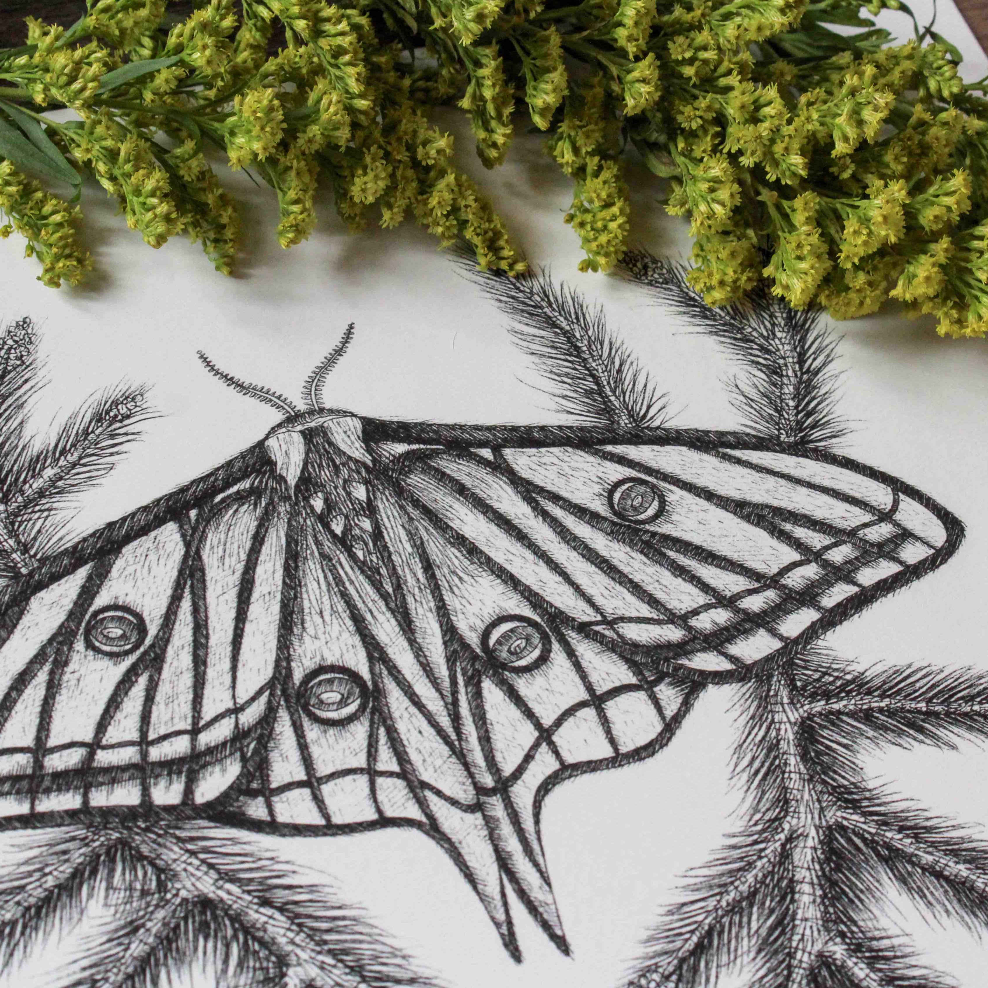 The Spanish Moon Moth is one of four drawings in my moth series. In each drawing, the moth is entangled in a plant that is essential for their growth and development. For the Spanish Moon moth, this is a pine tree. (Fun fact: Spanish Moon Moths are also referred to as “stained glass moths.”)