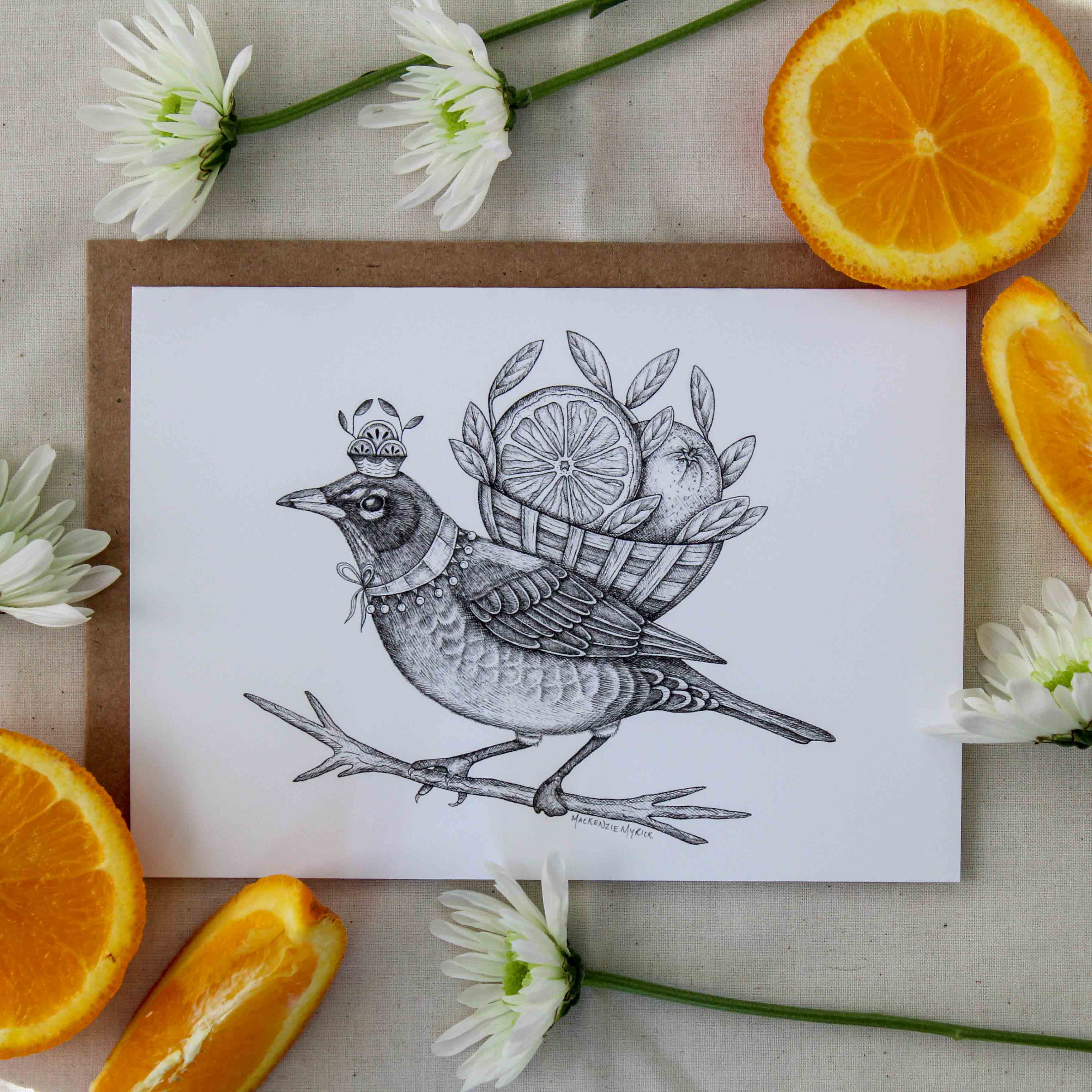 All hail the Orange Prince! Fresh fruit is a true delicacy for birds, and this Robin loves oranges. (I’m sure you could tell from the basket on his back!) He wears a citrus-inspired crown to distinguish himself as the ruler of the orange trees near his home.